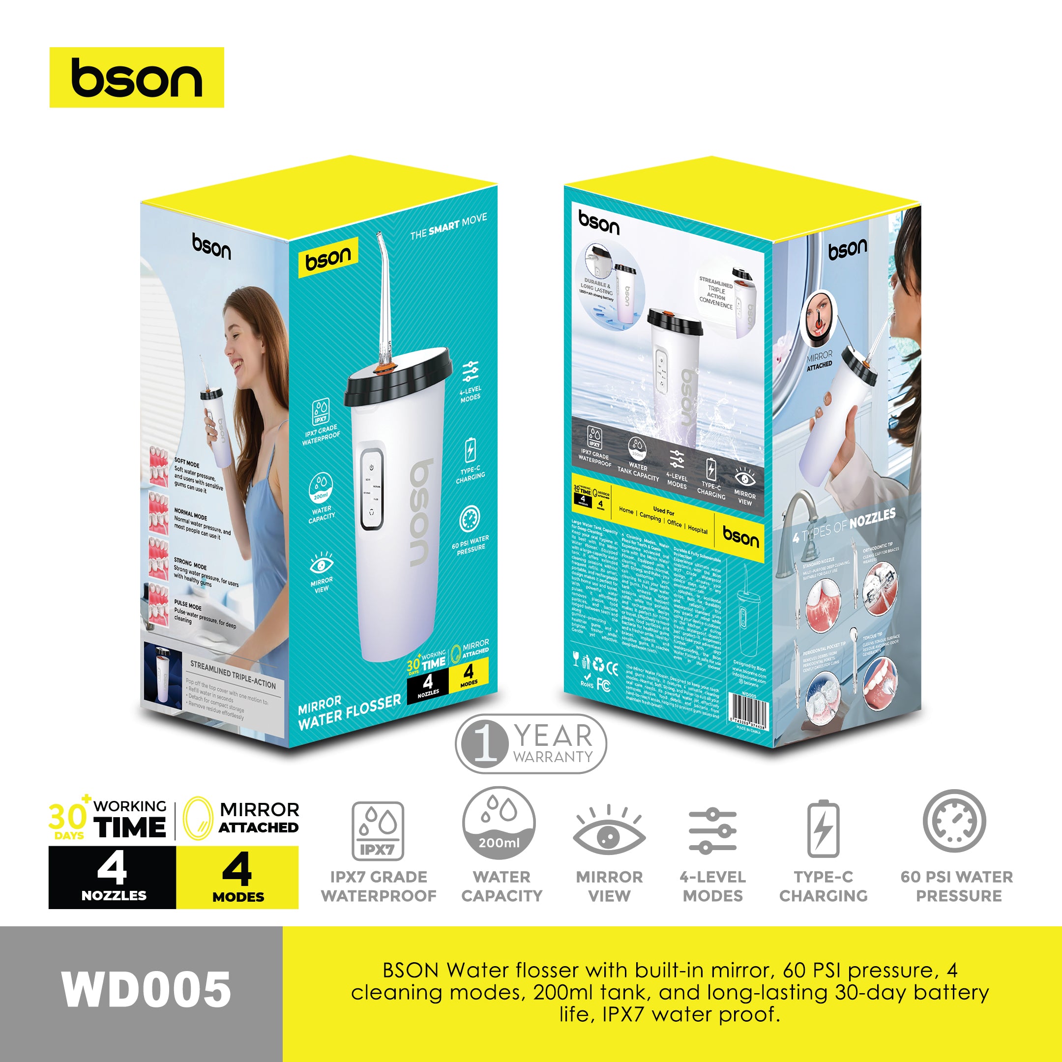 Maintain superior oral hygiene with the BSON Mirror Water Flosser, designed for effective and convenient daily dental care. The built-in mirror provides better visibility while flossing, allowing precise cleaning even in hard-to-reach areas.