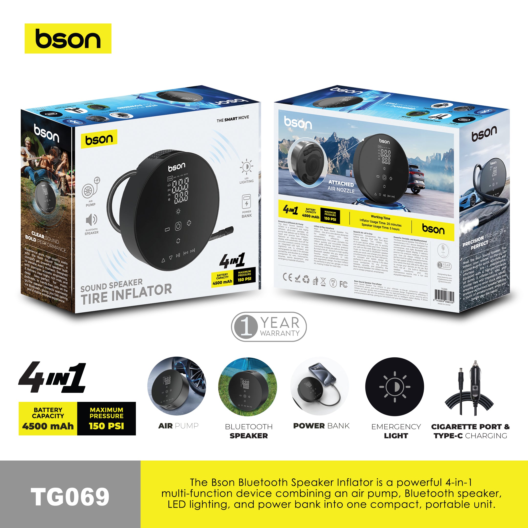 The Bson Bluetooth Speaker Inflator is a powerful 4-in-1 multi-function device that combines an air pump, Bluetooth speaker, LED light, and power bank into one compact and portable unit. Designed for convenience at home, on the road, or outdoors, it delivers reliable performance whenever you need it.
